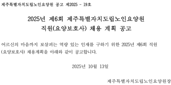 채용공고 2025년 제6회 제주특별자치도립노인요양원직원(요양보호사) 채용 계획 공고
