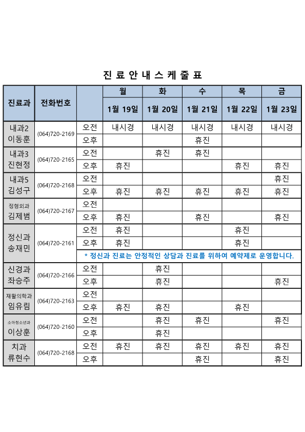 의료원 외래 진료 일정 (26.01.19.~01.23.)