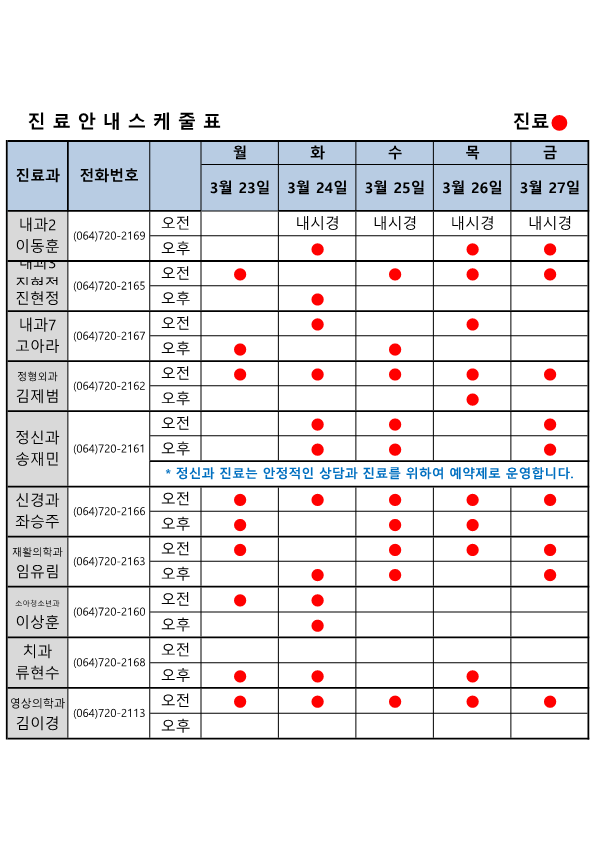 의료원 외래 진료 일정 (26.03.23~03.27)