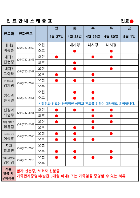 의료원 외래 진료 일정 (26.04.27~05.01)