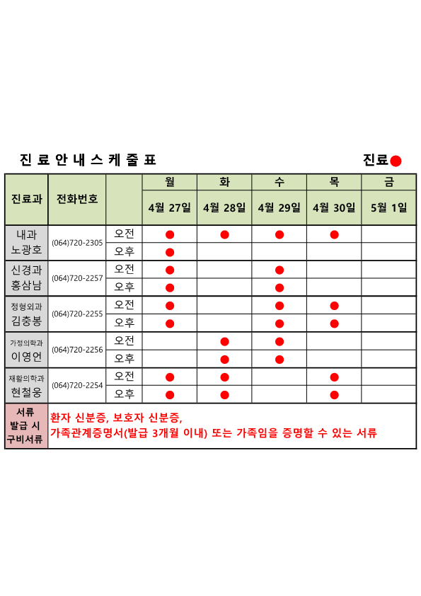 요양병원 외래 진료 일정 (26.04.27.~05.01.)