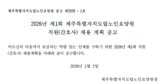채용공고 2026년 제1회 제주특별자치도립노인요양원 직원(간호사) 채용 계획 공고