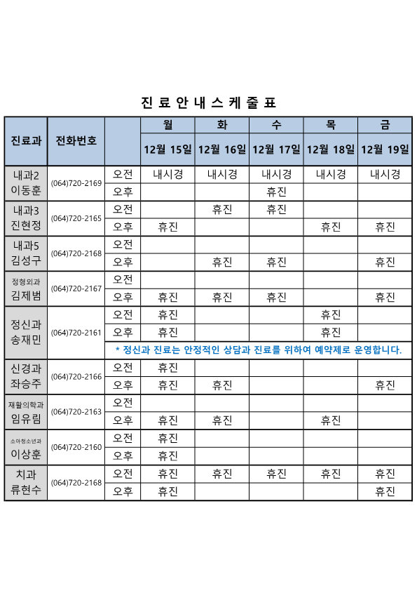 의료원 외래 진료 일정 (25.12.15.~12.19.)