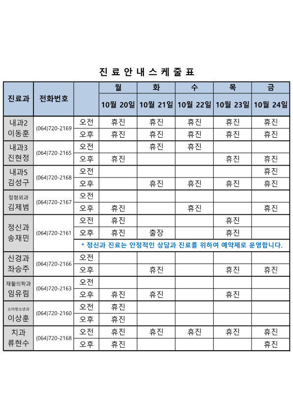 의료원 외래 진료 일정 (25.10.20.~10.24.)