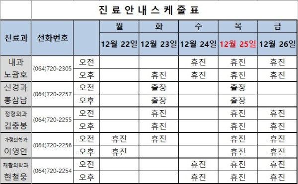 요양병원 외래 진료 일정 (25.12.22.~12.26.)