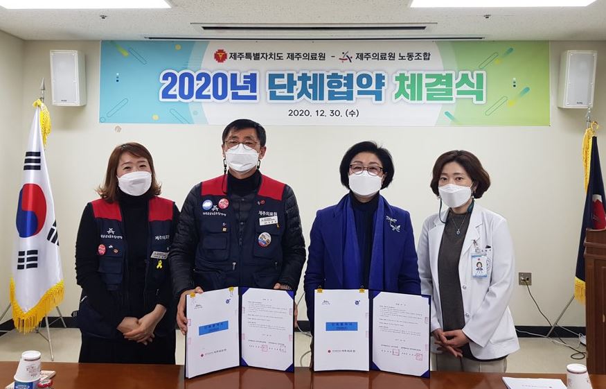제주특별자치도 제주의료원(원장 오경생)과 한국노총 전국공공노동조합 제주의료원 노동조합(위원장 김윤남)은 12월 30일 회의실에서 2020년도 단체협약을 체결했다.