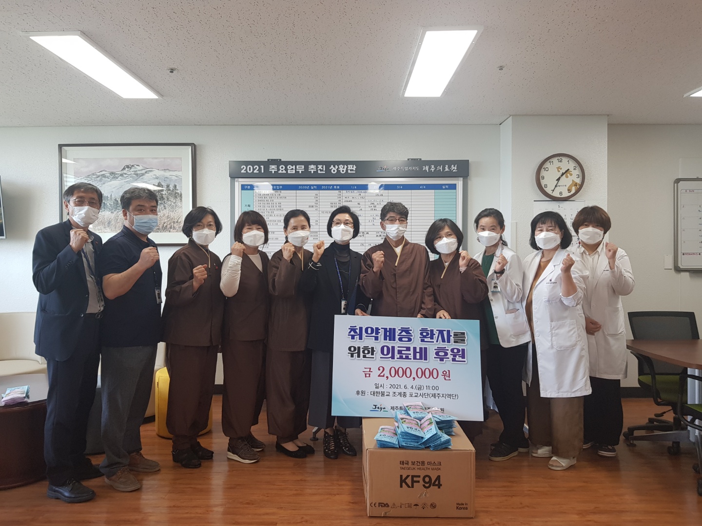제주특별자치도 제주의료원(원장 오경생)은 4일 대한불교 조계종 포교사단 제주지역단(회장 손영신)으로부터 원내 취약계층 의료비 지원을 위한 후원금 200만원과 마스트 1,000장은 기부 받았다.