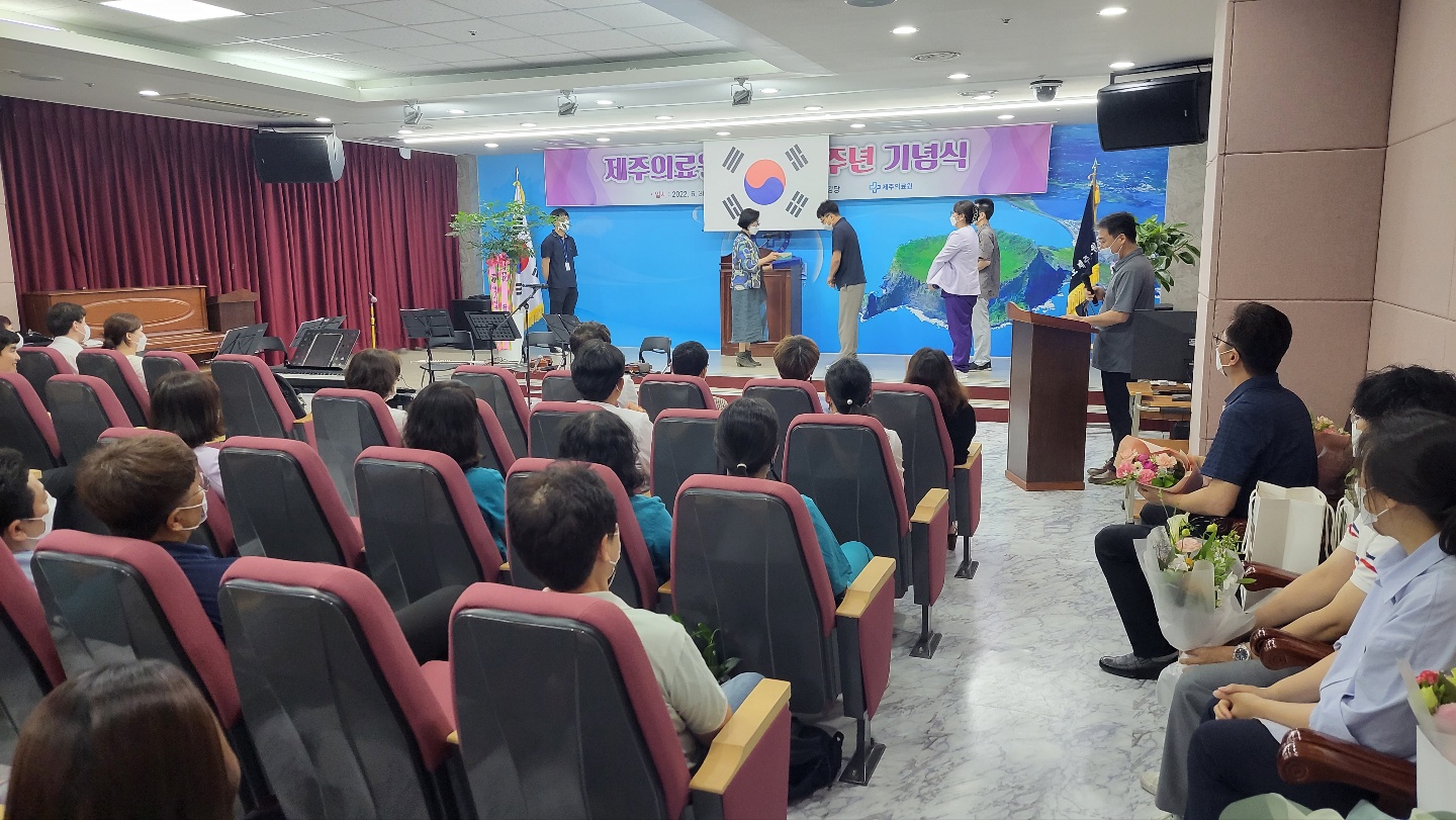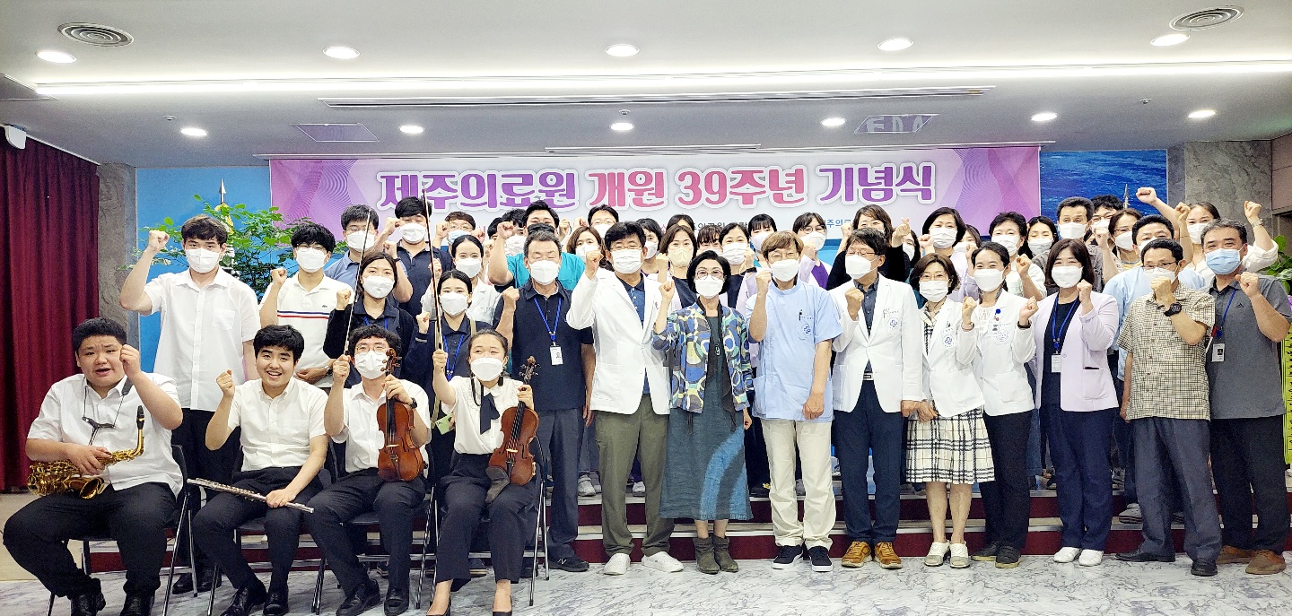 안녕하세요."도민들의 사랑이 제주의료원의 행복입니다."제주특별자치도 제주의료원(원장 오경생)은 30일 지하 대강당에서 개원 39주년 기념행사를 개최했다.이번 기념식에서는 도내 코로나 확산 방지를 위해 노력해온 임직원 20명에게 표창장이 수여됐다. 제주특별자치도 도지사 표창에는 박현희 간호과장, 문현정 수간호사, 김선영 감염관리실 담당, 고경훈 보호사, 신재관 계약 담당이 수상하였으며 의료원장 표창에는 고은파 간호사 등 12명이 수상했다.