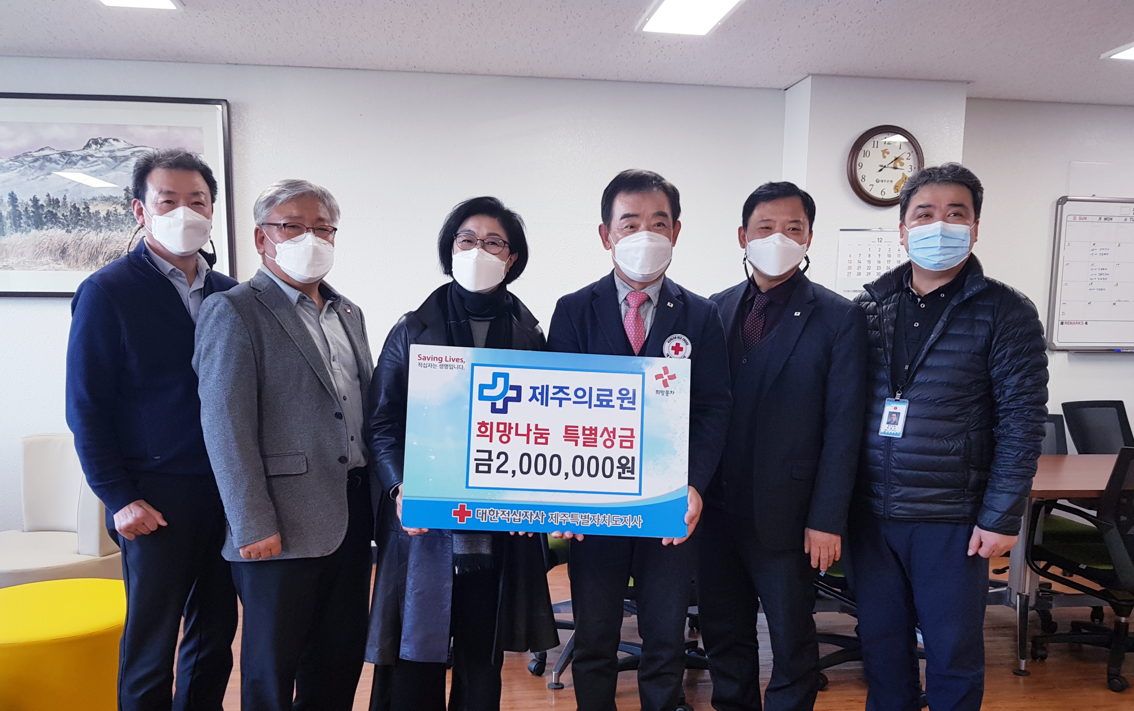 "도민들의 사랑이 제주의료원의 행복입니다."제주특별자치도 제주의료원(원장 오경생)은 14일 원장실에서 소외된 이웃을 위한 희망나눔 특별성금 200만원을 대한적십자사제주특별자치도지사(회장 오홍식)에 기탁했다.