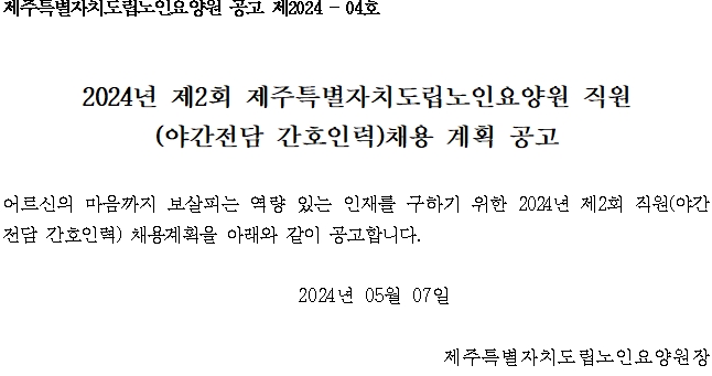 2024년 제2회 제주특별자치도립노인요양원 직원(야간전담 간호인력) 채용 계획 공고
