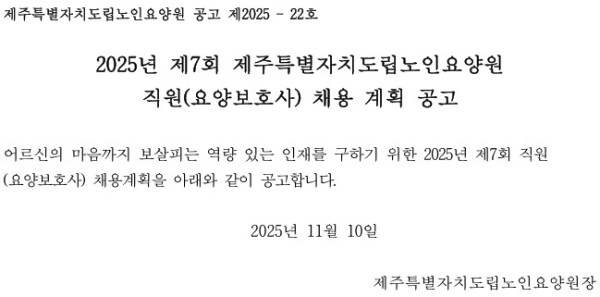 채용공고 2025년 제7회 제주특별자치도립노인요양원 직원(요양보호사) 채용 계획 공고