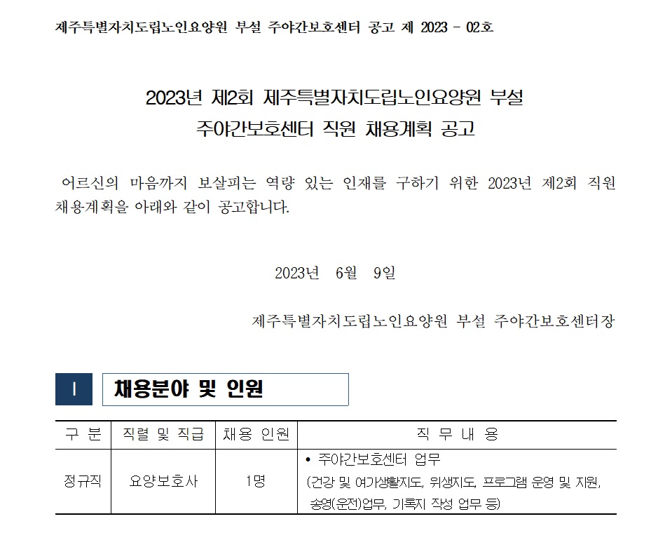 분류없음 2023년 제2회 제주특별자치도립노인요양원 부설 주야간보호센터 직원 채용계획 공고