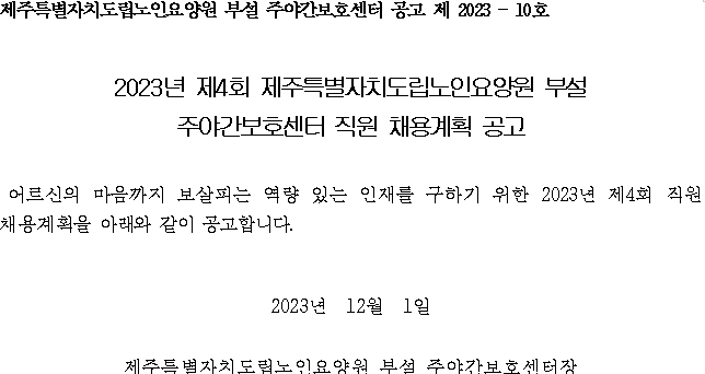 2023년 제4회 제주특별자치도립노인요양원 부설 주야간보호센터 직원(운전원) 채용계획 공고